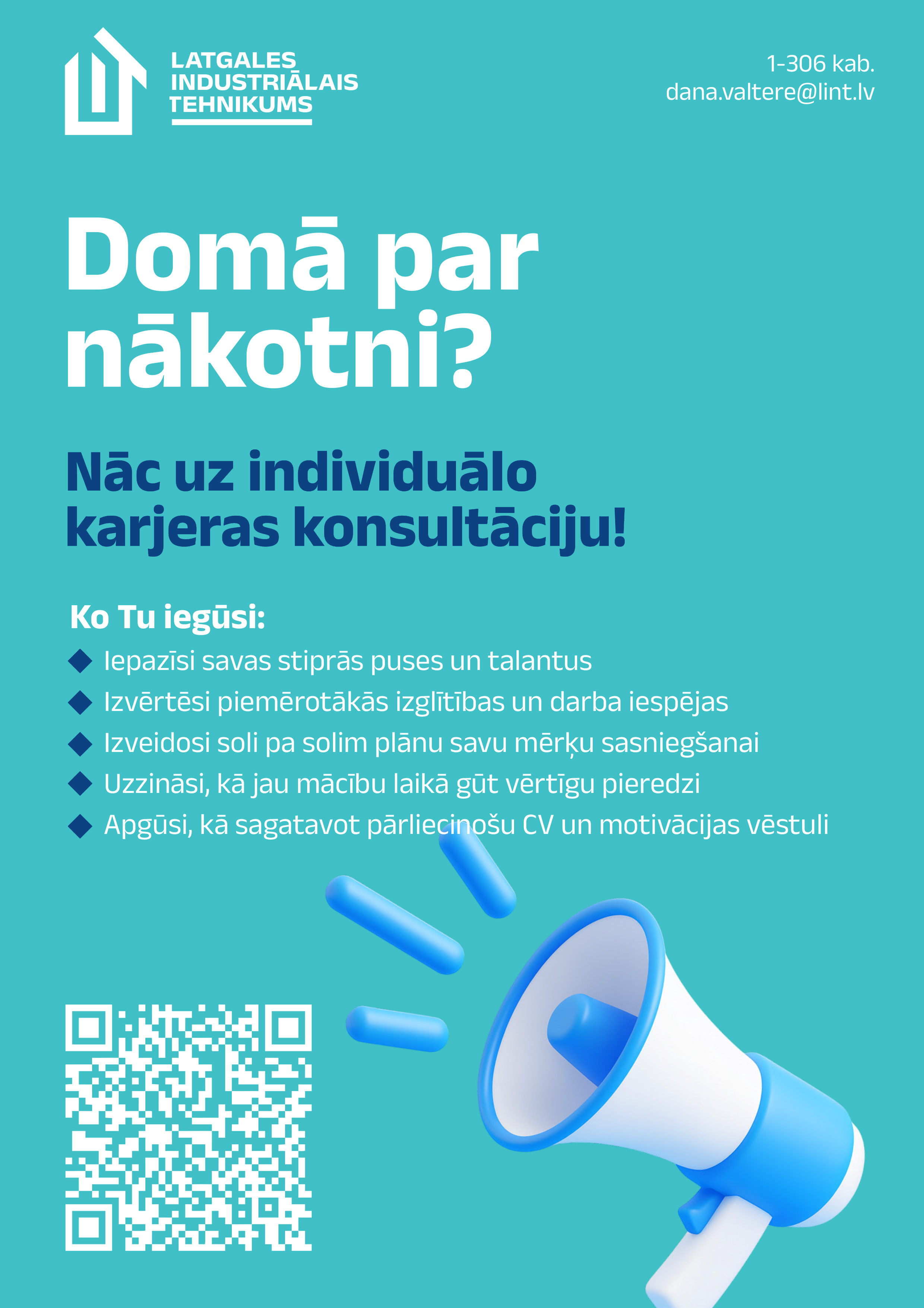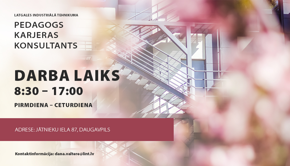 Ar karjeras atbalstu un tālākizglītību saistīta informācija pieejama Latgales Industriālā tehnikuma 1. korpusā, 306. kab., 3. stāvā.